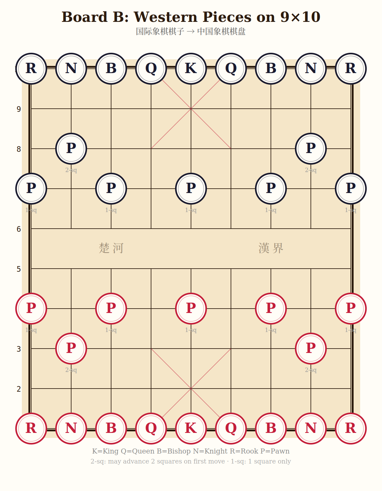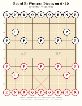 Board B — International Chess Pieces on a 9×10 Xiangqi Board