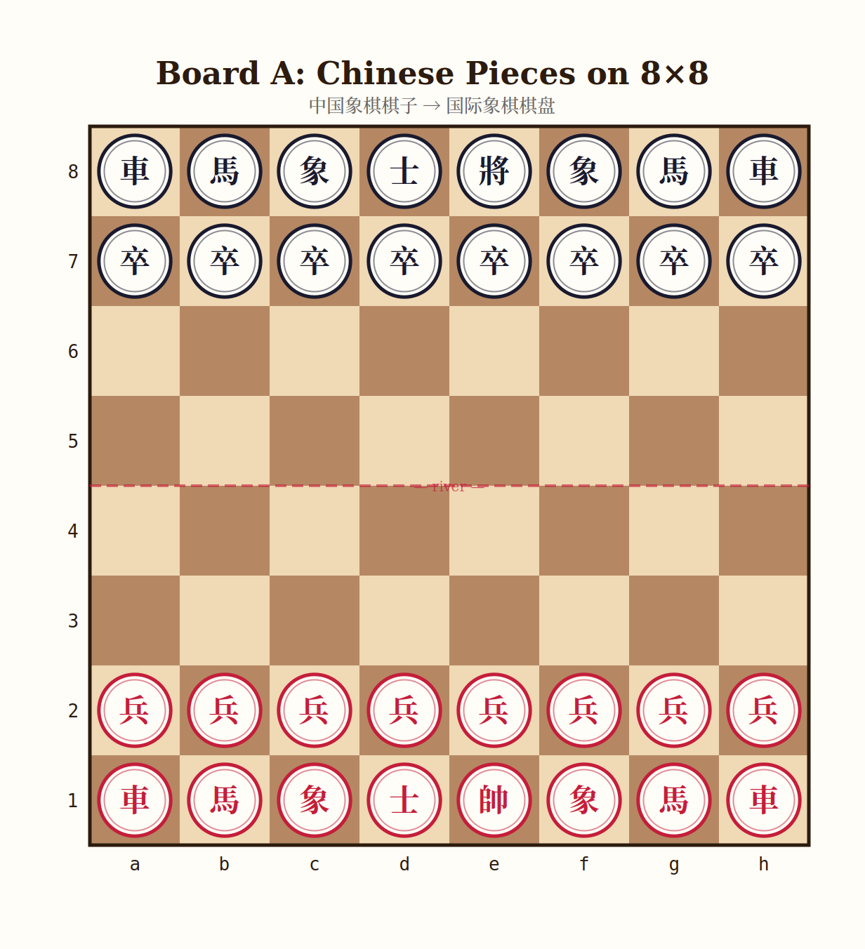 Board A — Xiangqi Pieces on an 8×8 Chessboard